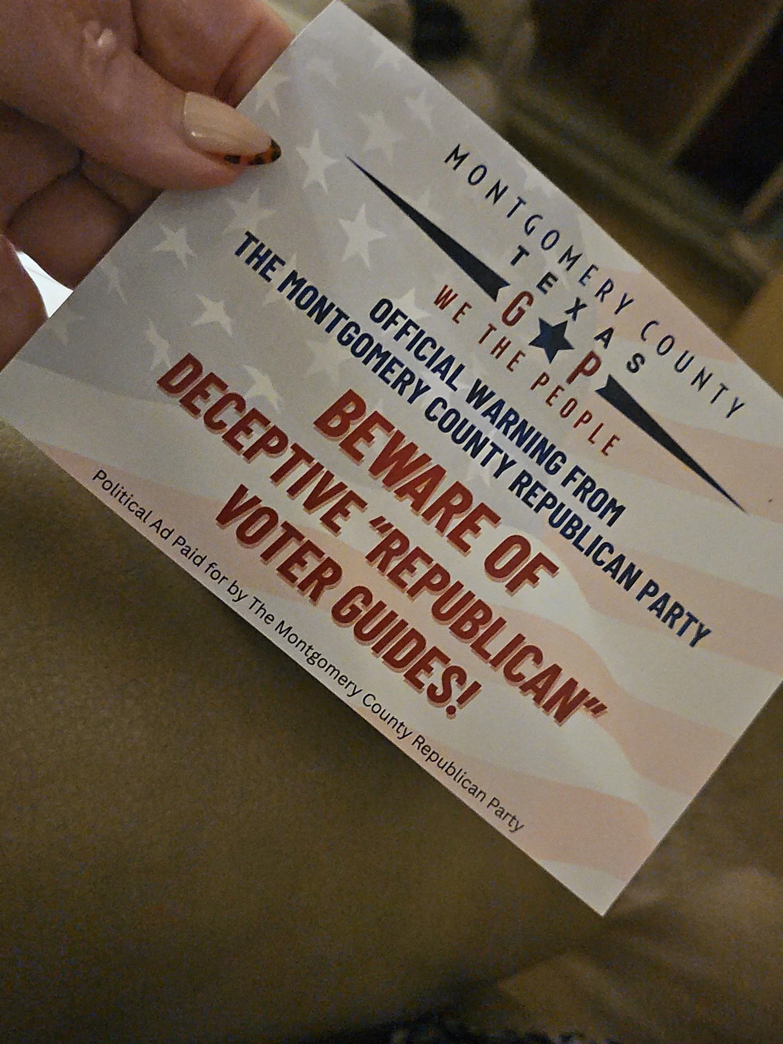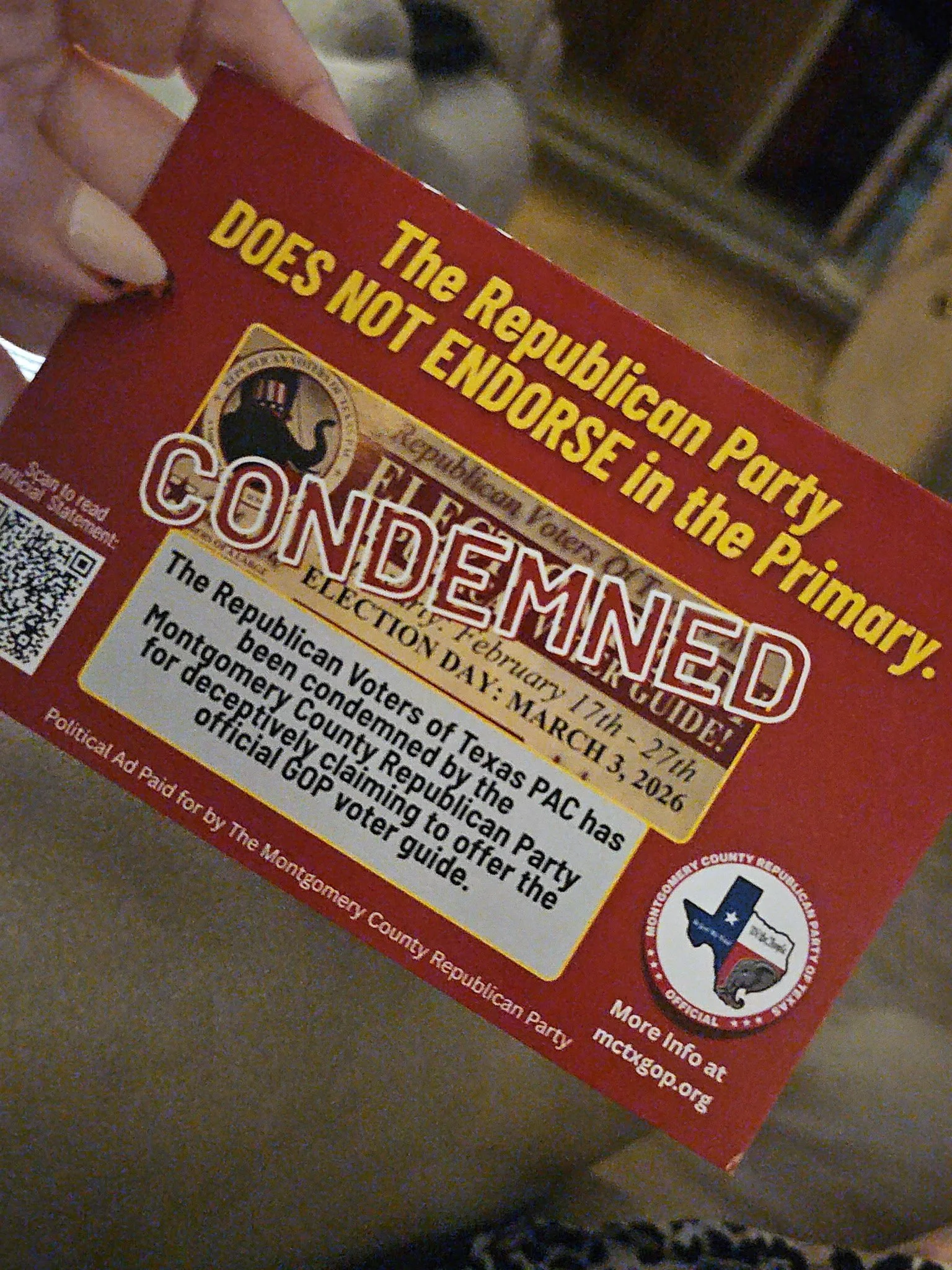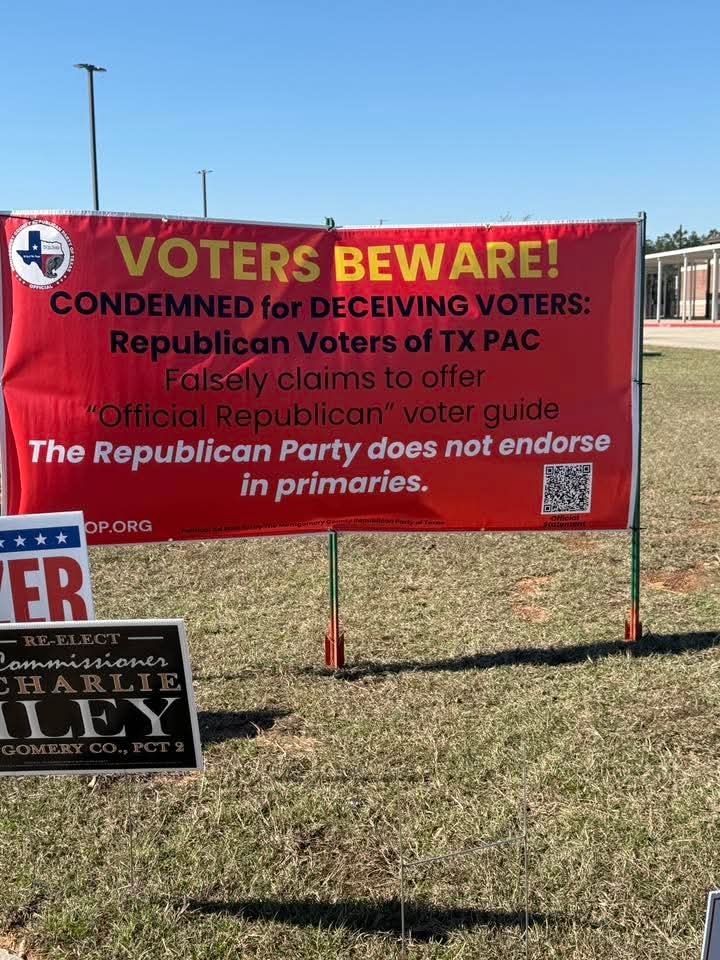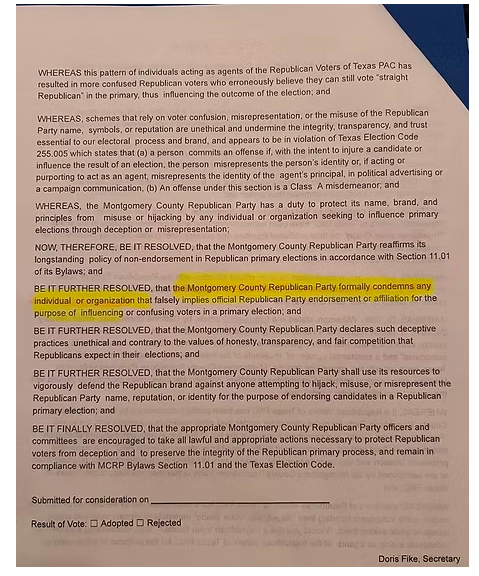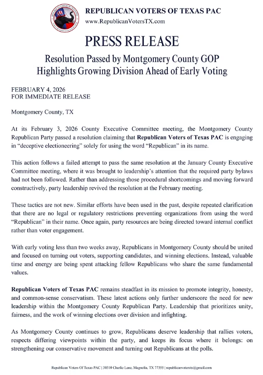At the February 3, 2026, Montgomery County Republican Party’s County Executive Committee (CEC) passed a resolution condemning the Republican Voters of Texas PAC for allegedly conducting “deceptive” electioneering through the use of the language “Republican Voter Guide” and by making endorsements in the Republican primary. The resolution cites party bylaws and the Texas Election Code as justification.