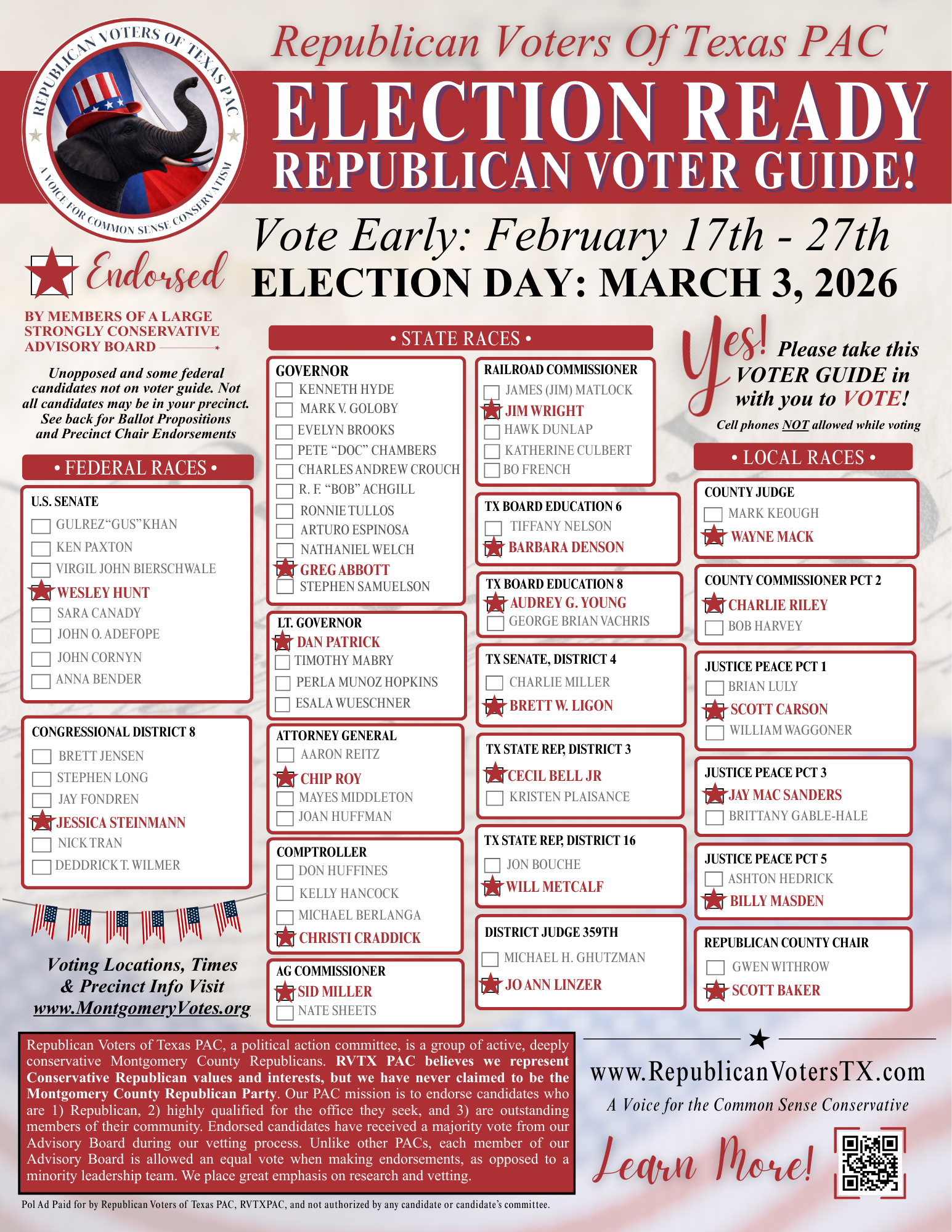 During this same CEC meeting, it was voted to authorize the use of $15,000 to attack our PAC. This money was used for postcards and banners placed at the polls. These signs and postcards falsely accuse RVTX PAC of “deceptively claiming to offer the official GOP voter guide.” Below is our voter guide used in the March 3, 2026 primary election. We will let you be the judge if this voter guide claims to be the “official GOP voter guide."